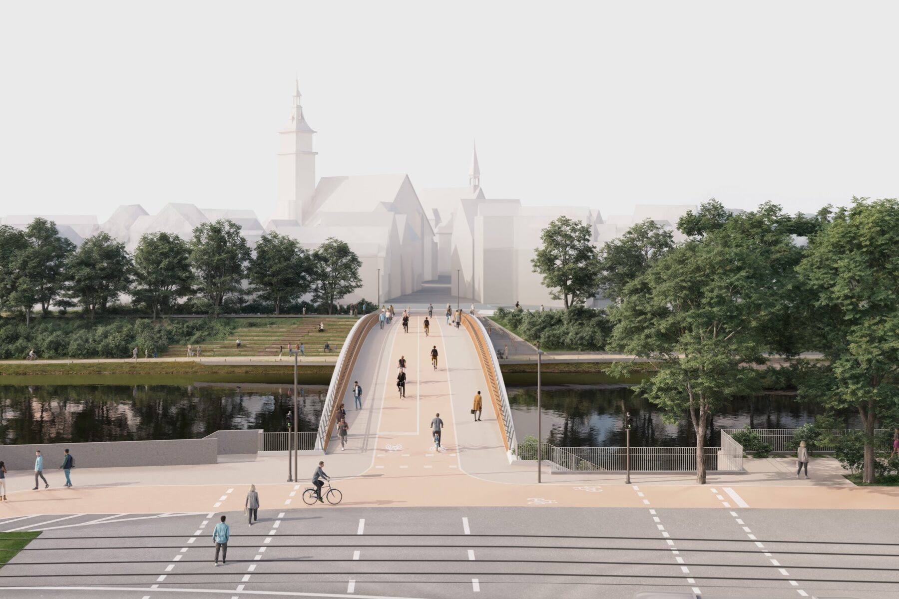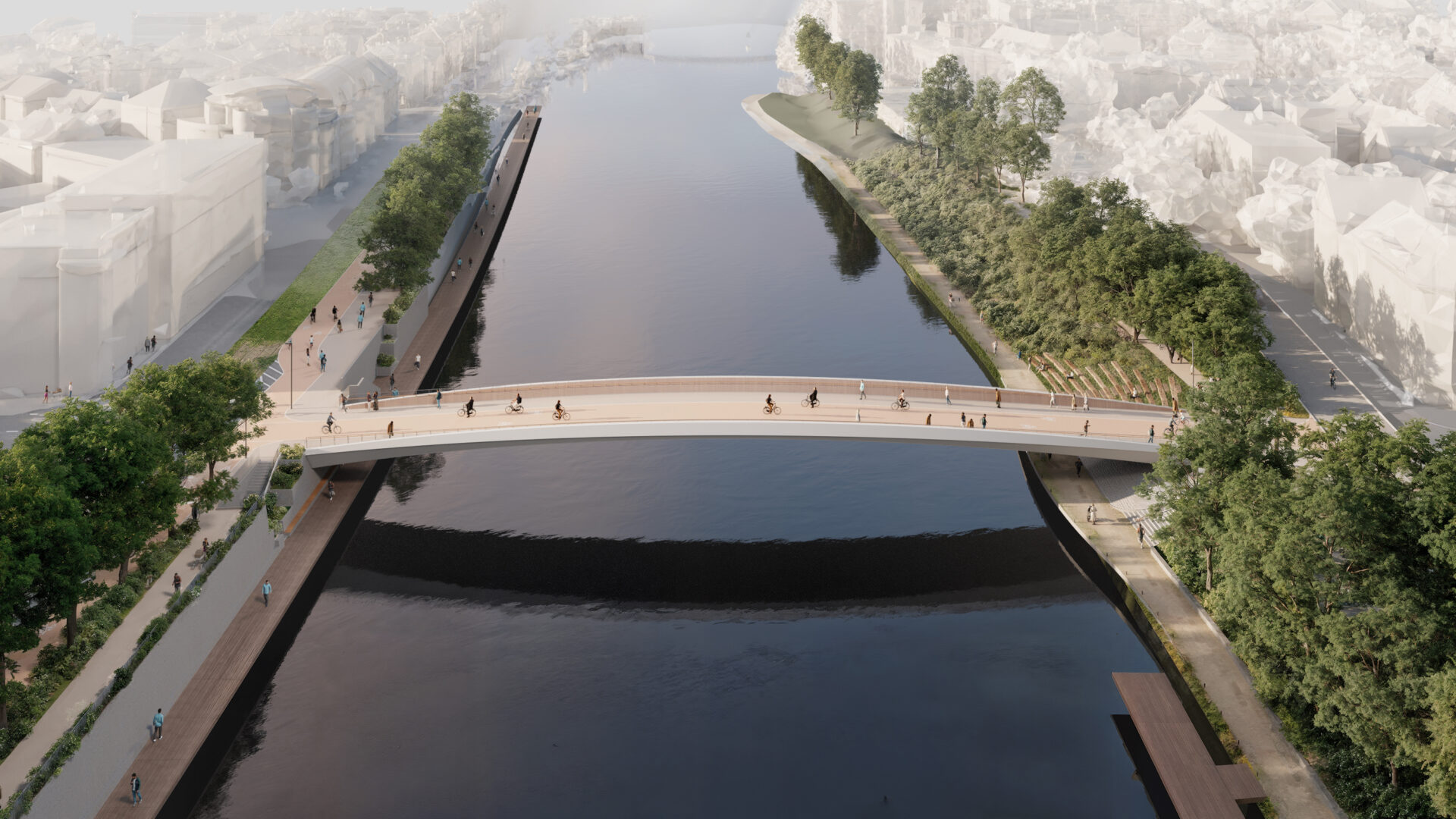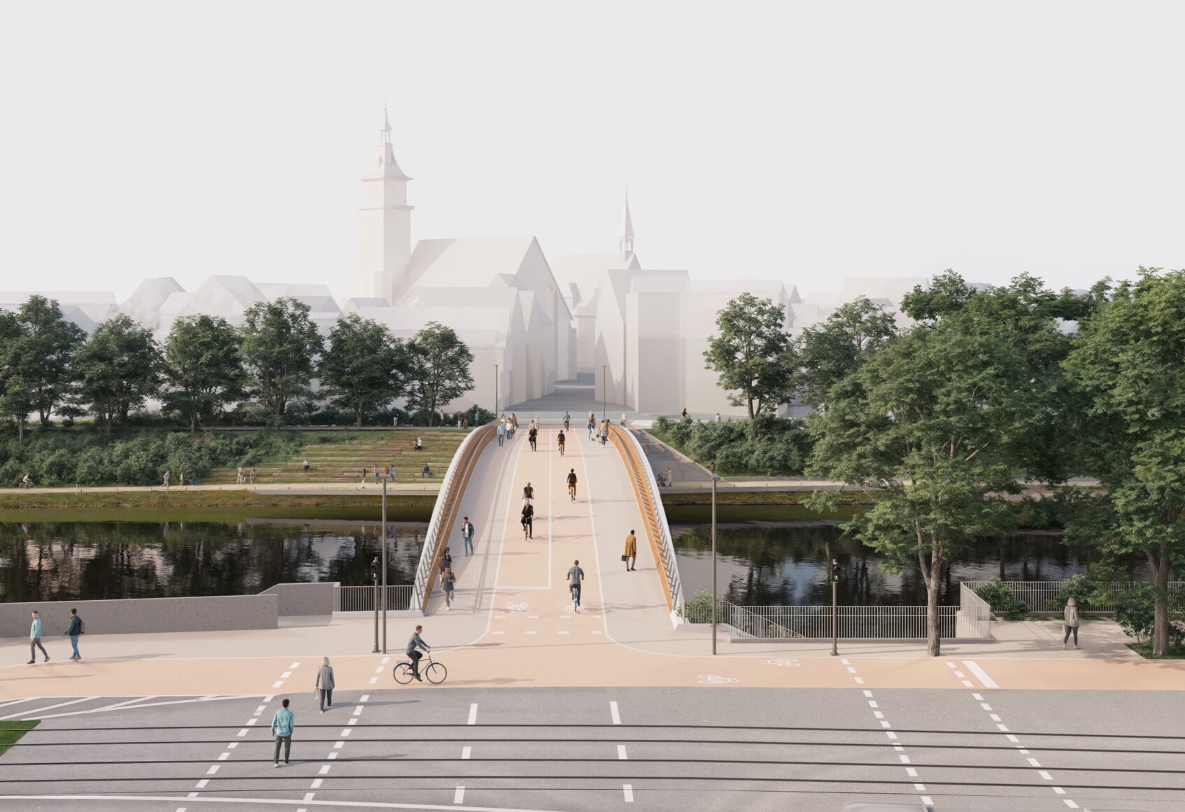 The bridge forms a key link for pedestrians and cyclists, with a generous 10.80 m-wide deck ensuring comfort and safety for all users. A central cycle lane creates a direct, intuitive route, while pedestrians benefit from side walkways with panoramic views. These routes are defined by a distinctive below-eye-level trough, clad in warm larch lamellas to create a human-scaled, tactile edge. Stainless steel mesh balustrades and timber handrails provide safety without compromising transparency.