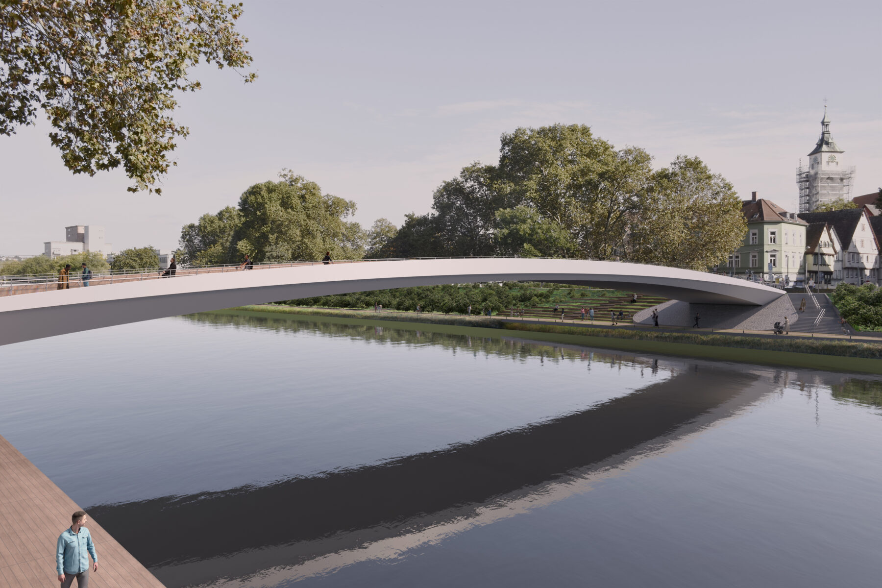 Echoing arch forms found in the Neckar bridge family, the structure features an integral variable-height trough cross-section, with its slimmest point at mid-span. Its understated, transparent design prioritises the quality of public space and unobstructed views.
