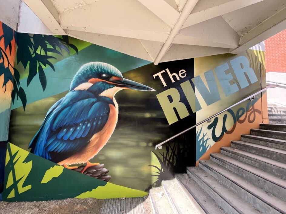 The finished mural celebrates Guildford’s riverside heritage, depicting a kingfisher, the willow trees over Guildford’s Town Bridge, a lesser celandine flower, and a narrowboat.